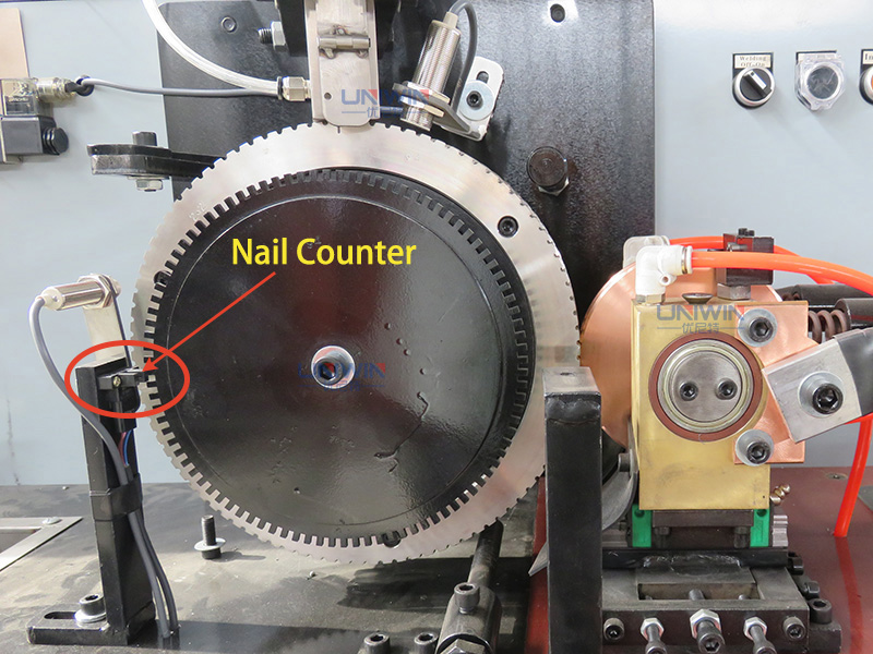 The counting wheel and nail counter are the vital components for accurately counting the number of nails in a coil produced, ensuring a consistent number of nails in each coil. The nail counter receives input from the counting wheel and records the number of nails processed based on the mechanical counting of the counting wheel.